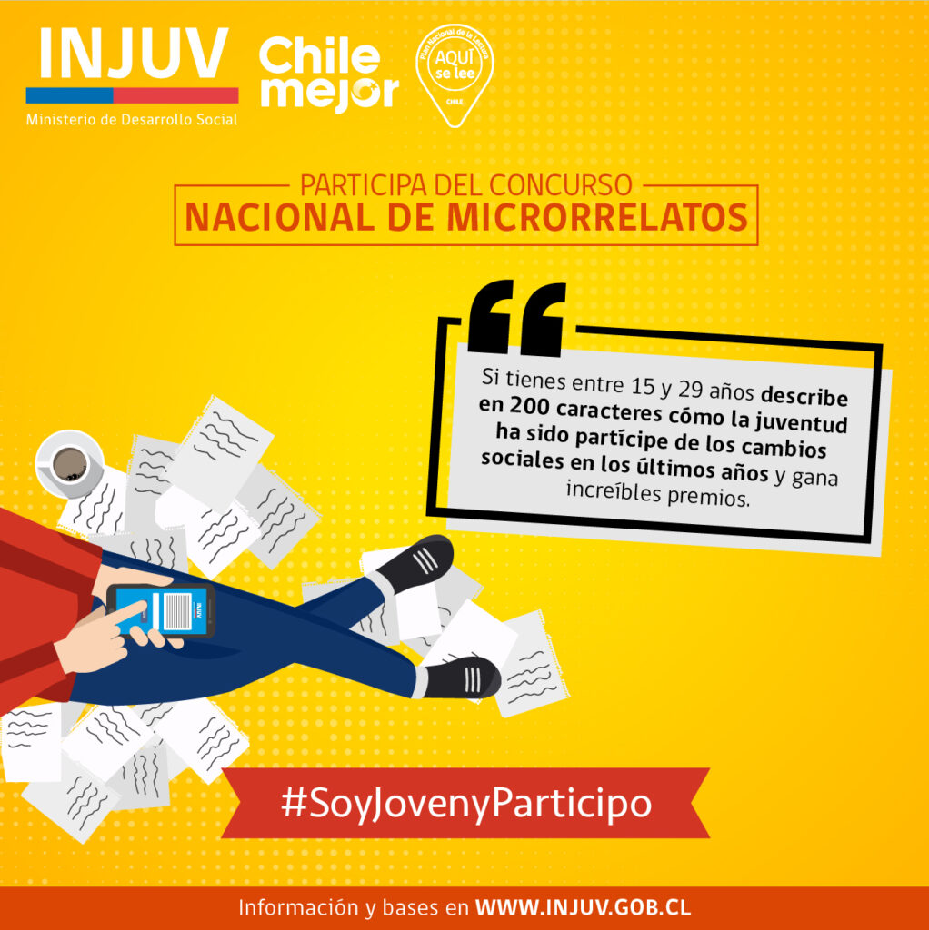 Si tienes entre 15 y 29 años, te invitamos a participar en el segundo Concurso Nacional de Microrrelatos #SoyJovenYParticipo, organizado por INJUV en el marco del Plan Nacional de la Lectura. En esta oportunidad las y los jóvenes concursantes deberán describir cómo la juventud ha realizado cambios importantes por medio de la Participación en un texto de 200 caracteres.