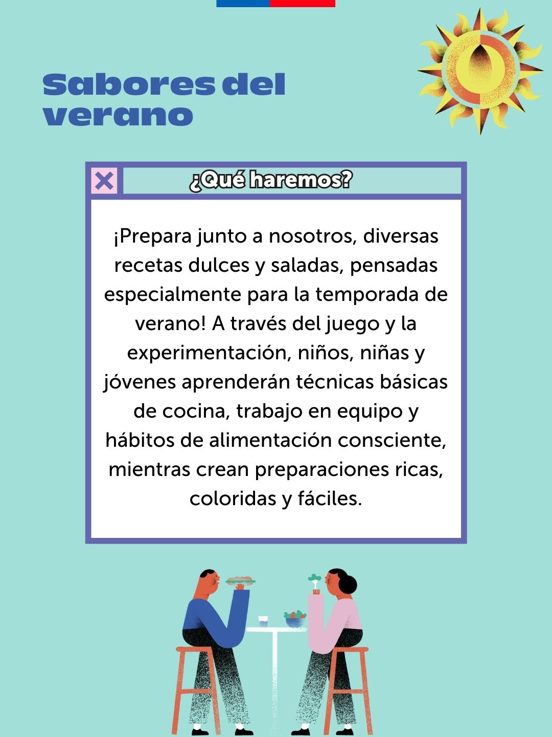 Este laboratorio creativo de cocina de verano invita a cocinar y disfrutar preparando recetas dulces y saladas frescas, pensadas especialmente para la temporada. A través del juego y la experimentación, las y los participantes aprenderán técnicas básicas de cocina, trabajo en equipo y hábitos de alimentación consciente, mientras crean platos ricos, coloridos y fáciles de replicar en casa.