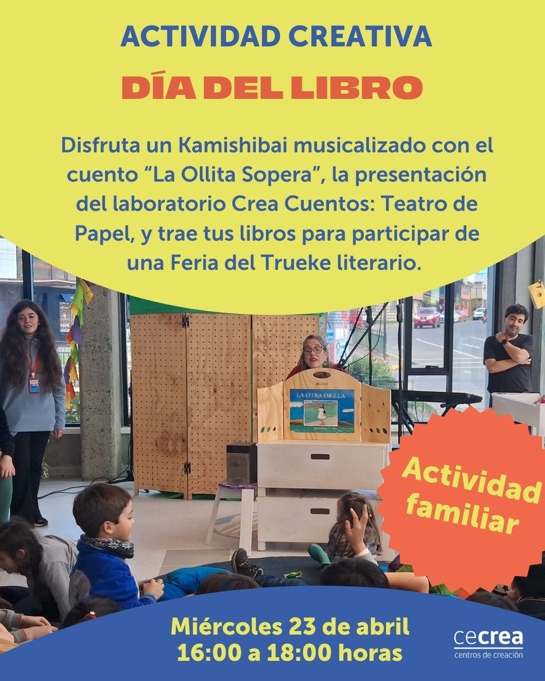 Cada 23 de abril, la UNESCO instauró las celebraciones por el Día Mundial del Libro y del Derecho de Autor. En cecrea queremos celebrarlo invitando a toda la comunidad a un cuenta cuentos en formato kamishibai musicalidad, en esta oportunidad se presentara el cuento "sopera" Versión chilena de los hermanos Grimm que subraya la importancia de hacer comunidad y compartir con las y los démas mienbros de forma desinteresada. Antes de esta presentación, se compartirá el trabajo realizado en el laboratorio Crea Cuentos: Teatro de Papel. Además, en el hall de Cecrea Valdivia, se realizará una feria del trueke literaria en la que se invitará a traer e intercambiar libros.