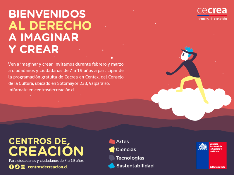 Cecrea es un programa del Ministerio de las Culturas, las Artes y el Patrimonio que promueve el derecho a imaginar y crear de ciudadanos y ciudadanas de 7 a 19 años, a través de la convergencia de las artes, las ciencias, las tecnologías y la sustentabilidad.